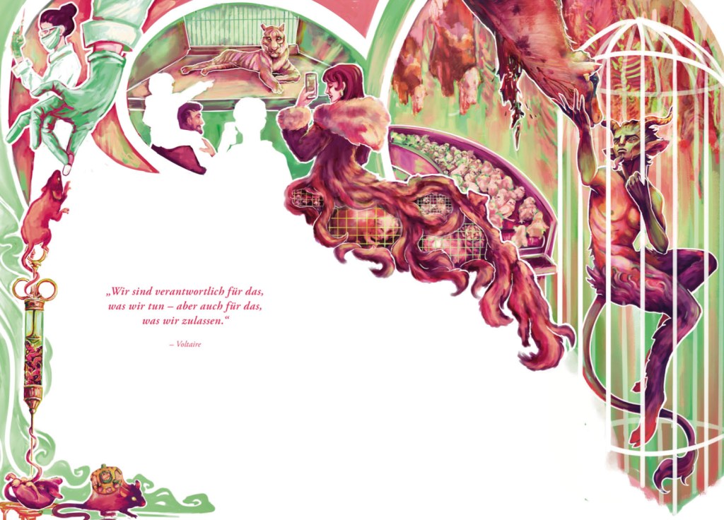 Jede dieser Figuren gestaltet sie in zwei Versionen: eine klassische Darstellung und eine moderne Interpretation, die aktuelle gesellschaftliche Missstände sichtbar macht. Ergänzt werden die Illustrationen durch erklärende Texte sowie poetische Passagen, die Pias persönliche Auseinandersetzung mit den jeweiligen Themen vermitteln und den Blick der Betrachter*innen erweitern sollen.