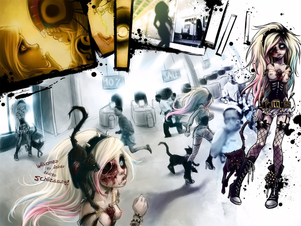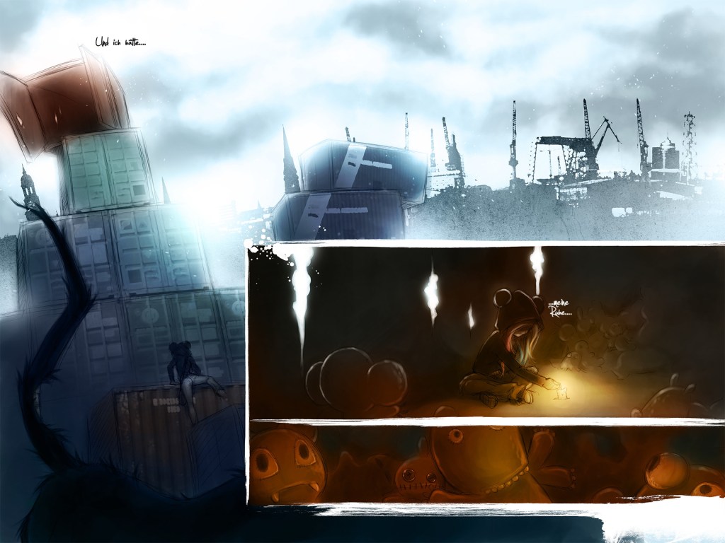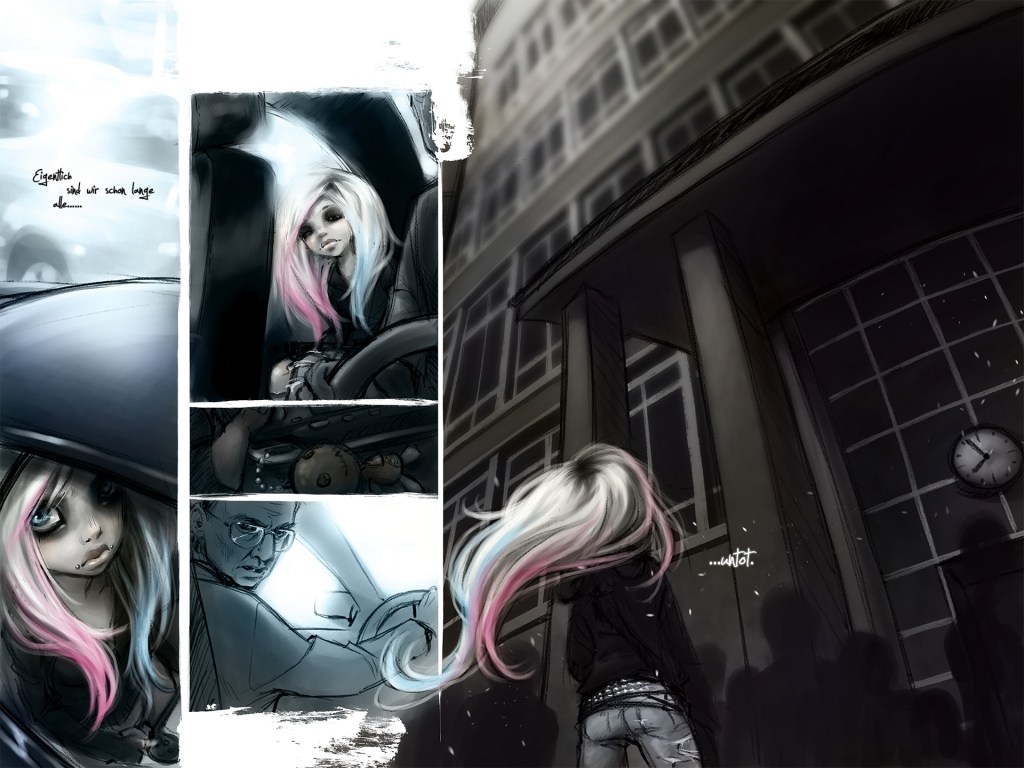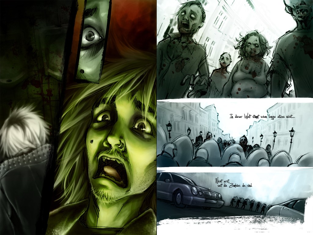 Rotten Romance ist eine Abschlussarbeit und bewegt sich bewusst im Zombie‑Genre. Statt reiner Schockeffekte setzt die Arbeit auf erzählerische Atmosphäre: Eine Comic‑Sequenz, deren Panels fein ausgearbeitet sind und über Details Stimmung und Bedeutung transportieren. Die Zeichnungen arbeiten mit Kontrasten – Verfall und Nähe, Härte und Zärtlichkeit – und zeigen, wie sich ein düsteres Thema gestalterisch differenziert erzählen lässt.