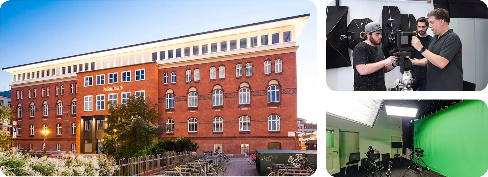 Historisches Gebäude, moderne Ausstattung: Unser Campus Hamburg (Altona & Bahrenfeld) bietet ein Radio- und Fotostudio, ein Regieraum, ein Green Screen und TV Studio und eine Technikausleihe (Arsenal).